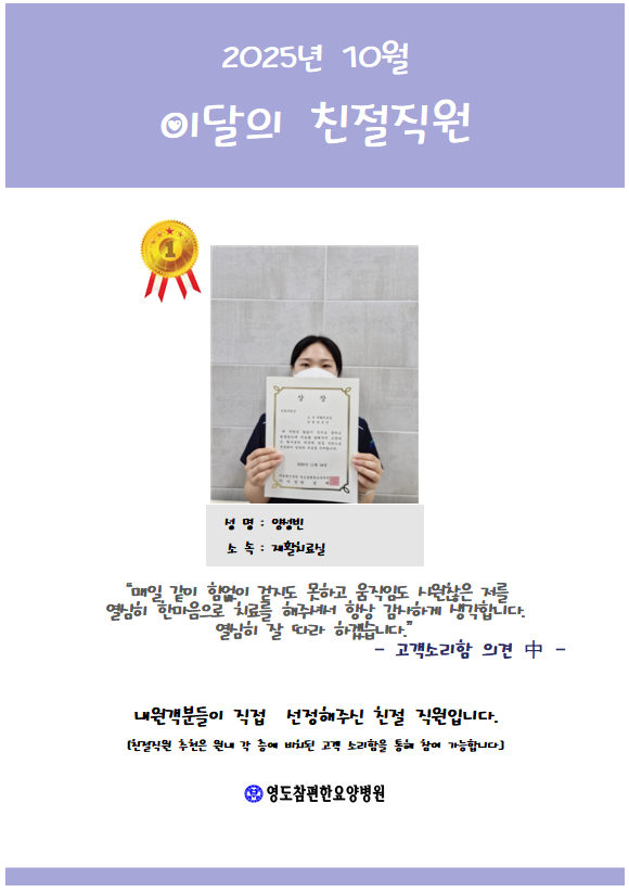 [안내] 2025년 10월 친절직원 선정 본문 우리 병원에서는 원내 각 층에 비치되어 있는 고객소리함을 통해 매달 친절 직원을 선정하고 있습니다.최상의 의료서비스를 제공하기 위해 더욱 더 노력하는 영도참편한요양병원 직원들이 되겠습니다. 목록 다음글
